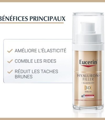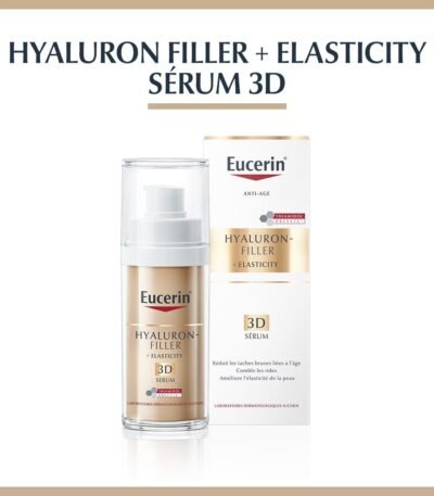 Le sérum Eucerin HYALURON FILLER + ELASTICITY 3D, riche en Acide Hyaluronique, lutte efficacement contre les rides et la perte d’élasticité pour une peau visiblement rajeunie.