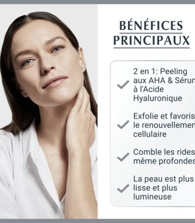 EUCERIN Hyaluron-Filler, Peeling sérum Nuit, Affine le grain de peau Favorise le renouvellement cellulaire, Comble les rides, même profondes 30ml. La production naturelle d'Acide Hyaluronique de la peau décroît avec l'âge : des rides et ridules se forment, la peau paraît moins jeune. Le Peeling & Sérum Nuit HYALURON-FILLER + 3x EFFECT exfolie et affine la texture de la peau, favorise le renouvellement cellulaire et comble les rides, même les plus profondes. Sa forumle triple effet : 1. Comble 2. Affine le grain de peau 3. Régénère Le Peeling & Sérum Nuit HYALURON-FILLER + 3x EFFECT combine deux formules puissantes pour de multiples bénéfices anti-âge : - Une peau lissée et lumineuse : L'émulsion crémeuse contient un complexe AHA (alpha-hydroxy-acide) efficace et de la Glycine Saponine. Les AHA, dont beaucoup sont connus sous le nom d'acides de fruits, exfolient la peau tandis que la Glycine Saponine favorise la production d'Acide Hyaluronique dans les cellules épidermiques où naissent les rides profondes. - Hydratation et comblement des rides: Le gel transparent associe l'Acide Hyaluronique concentré de haut et de bas poids moléculaire. L'Acide Hyaluronique de haut poids moléculaire aide à lisser les couches supérieures de l'épiderme tandis que l'Acide Hyaluronique de bas poids moléculaire (qui est 40 fois plus petit) pénètre plus profondément dans les couches de l'épiderme où naissent les rides plus profondes.