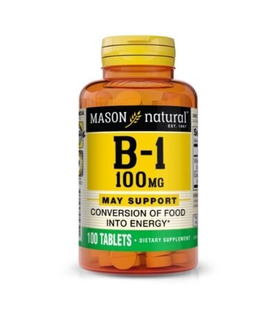 Mason Natural B-1 100 mg est un complément alimentaire riche en vitamine B1 (thiamine), essentielle pour le métabolisme énergétique, le bon fonctionnement du système nerveux et la santé cardiovasculaire. Boîte de 100 comprimés.