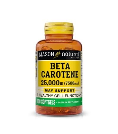 Mason Natural Beta Carotene est un complément alimentaire riche en bêta-carotène, un puissant antioxydant précurseur de la vitamine A. Il contribue à la santé de la peau, des yeux et du système immunitaire. Boîte de 100 capsules molles (softgels).