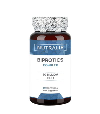 Biprotics Complex de Nutralie est présenté dans un emballage contenant 60 gélules 100% gastro-résistantes et à enrobage végétal.
