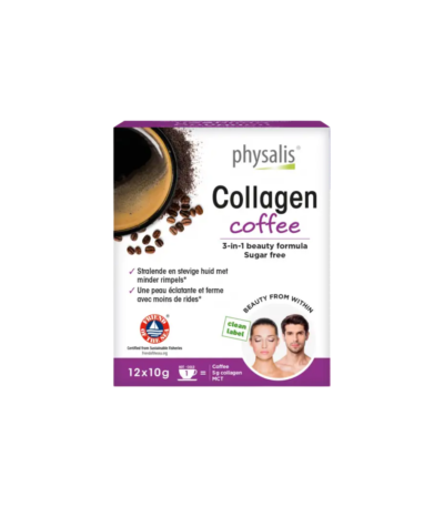 Physalis Collagen Coffee is a 3-in-1 instant drink combining 100% Arabica coffee, marine collagen (Naticol®), and coconut MCTs. Each sachet delivers 5 g of collagen to support skin elasticity, plus a smooth, energizing coffee taste. Perfect for beauty from within, in just one cup a day.