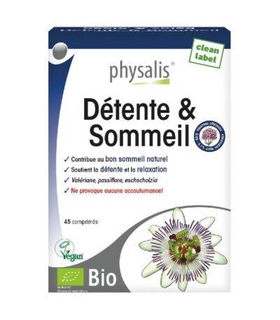 Le complément Physalis Detente Et Sommeil 45 comprimes favorise relaxation et sommeil naturel pour un bien-être optimal, par PHYSALIS.