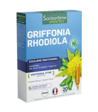Les ampoules Griffonia Rhodiola de Santarome Bio forment un complément alimentaire qui associe phytothérapie et gemmothérapie pour jouer un rôle dans le bon fonctionnement du système nerveux