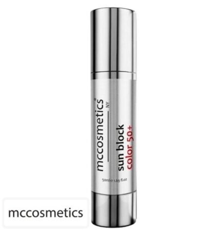 Mccosmetics Total Sun block color 50+ 50ml : protection solaire SPF 50+ teintée, hydratante, résistante à l'eau, idéale pour tous types de peau et usage quotidien.