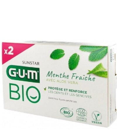 GUM Dentifrice Menthe Fraîche Aloe Vera Bio Lot de 2 x 75 ml : un soin naturel bio pour des dents propres, gencives apaisées et une haleine fraîche au quotidien.