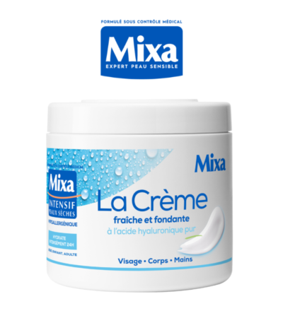 La Crème Fraîche et Fondante de Mixa, enrichie en acide hyaluronique pur, hydrate immédiatement les peaux sèches et sensibles pendant 24 heures, offrant une texture légère et non collante pour un confort optimal.