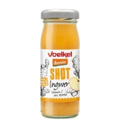 Shot de gingembre biologique de Voelkel est un jus de fruit bio à base de pomme, d’acérola et de citron.