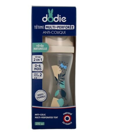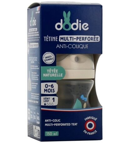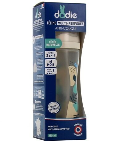 Le biberon à tétine multi-perforée Dodie est un biberon anti-colique qui se distingue par sa tétine, dotée de plusieurs caractéristiques