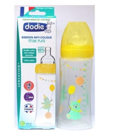 Le Biberon Initiation+ 330 ml Débit 3 - 2ème Age Dodie possède une tétine avec une valve brevetée anti-colique, anti-régurgitation, anti-aérophagie.