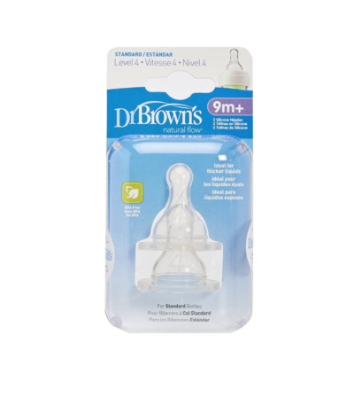 Tétines Level 4 col étroit DR BROWNS, adaptées dès 9 mois, anti-colique, silicone sans BPA, confort et sécurité pour bébés en puériculture.