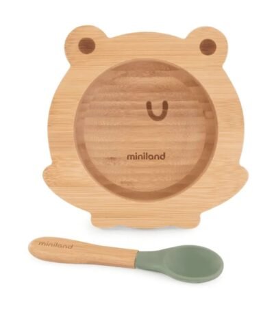 Le set Miniland avec assiette et cuillère en bambou, respectueux de l’environnement, est idéal pour les jeunes enfants. Leur conception en bambou naturel, alliée à des éléments en silicone alimentaire, favorise une alimentation autonome tout en protégeant les gencives sensibles des tout-petits. Disponible en designs Grenouille et Poussin.