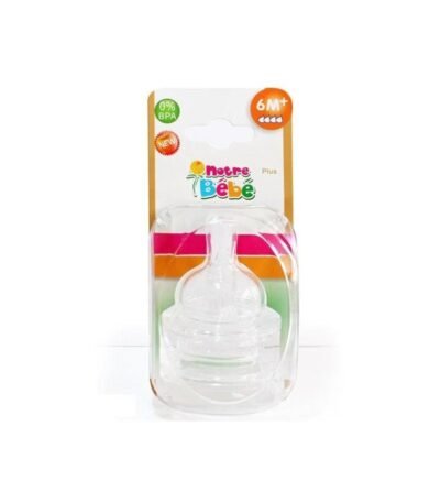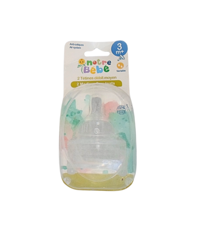 Lot de 2 tétines débit variable +3m de NOTRE BEBE, adaptées à tous biberons, silicone sans BPA pour une alimentation sécurisée et confortable.