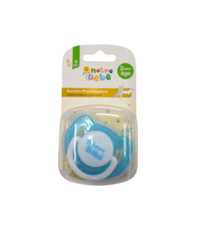 Sucette physiologique dès 6 mois par NOTRE BEBE : sécurisée, confortable, conçue pour le développement bucco-dentaire du bébé. Qualité et livraison rapide au Maroc.