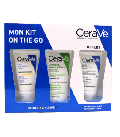 CeraVe Mon Kit On the Go est un trio essentiel pour une peau hydratée et protégée partout où vous allez. Il comprend une Crème Hydratante (52ml), une Crème Hydratante SPF 50 pour une protection solaire efficace, et une Crème Moussante pour un nettoyage doux, idéal pour une routine complète en déplacement.