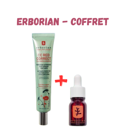 Profitez du coffret ERBORIAN CC Red Correct 45ml + Skin Therapy 10ml, idéal pour corriger les rougeurs et apaiser les peaux sensibles. Offre en promotions beauty exclusive.