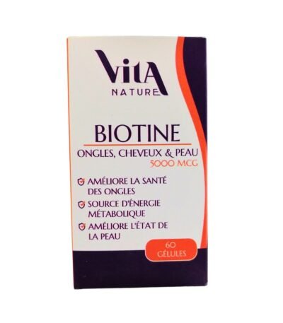 Vita Nature Biotine 5000mcg - 60 Gélules est un complément alimentaire destiné à améliorer la santé des cheveux, de la peau et des ongles, tout en soutenant le métabolisme énergétique.