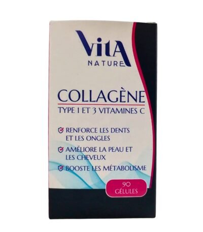 Vita Nature Collagène - 90 Gélules est un complément alimentaire qui favorise la santé de la peau, des articulations et des cheveux, en soutenant la production naturelle de collagène dans le corps.