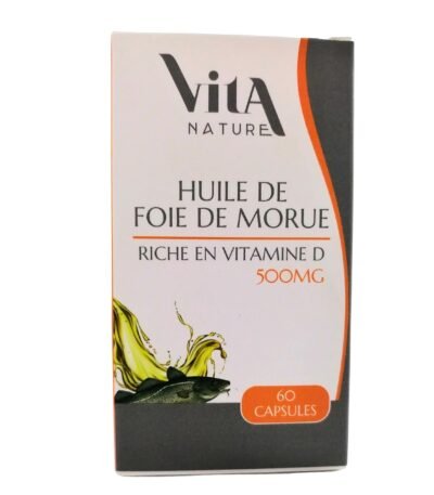 Vita Nature Huile de foie de Morue 500mg - 60 capsules est un complément alimentaire riche en acides gras oméga-3, vitamines A et D, pour soutenir la santé articulaire, la vision et renforcer le système immunitaire.