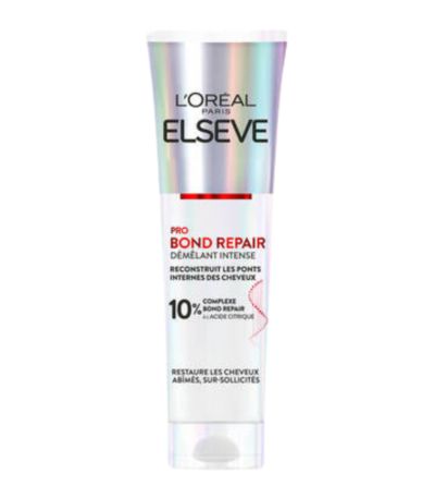 Elseve Pro Bond Repair Démêlant Intense 150ml répare et démêle instantanément les cheveux abîmés, tout en renforçant la fibre capillaire.
