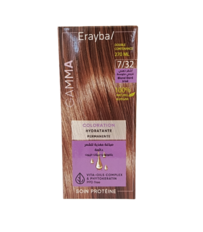 La Erayba Gamma Coloration 7/32 Blond Doré Irisé est une coloration permanente professionnelle qui offre une teinte lumineuse et naturelle, tout en prenant soin de la fibre capillaire.