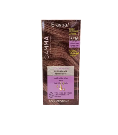 La teinte 5/36 Châtain Clair Doré Irisé d’Erayba Gamma Next combine des reflets dorés et irisés pour un résultat naturel et éclatant. Formulée sans ammoniaque, PPD ni silicones, elle est enrichie en phytokératine, huile de macadamia et vitamine C pour hydrater et protéger les cheveux. Elle assure une couverture optimale des cheveux blancs et convient à tous types de cheveux.