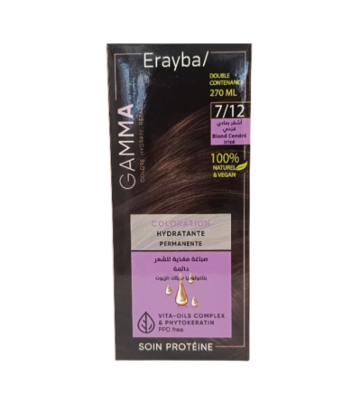 La teinte 7/12 Blond Cendré Irisé d’Erayba Gamma Next offre un blond moyen aux reflets cendrés et irisés, pour un résultat naturel et élégant. Formulée sans ammoniaque, PPD ni silicones, elle est enrichie en phytokératine, huile de macadamia et vitamine C pour hydrater et protéger les cheveux. Elle assure une couverture optimale des cheveux blancs et convient à tous types de cheveux.