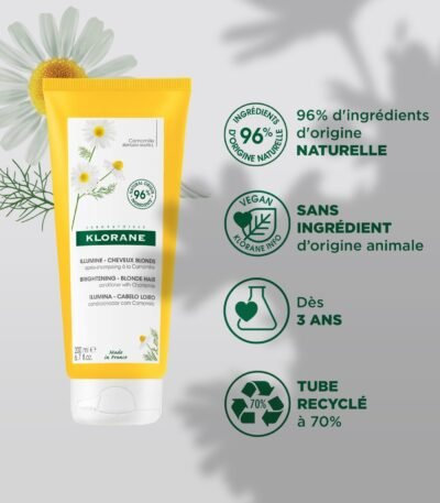 KLORANE Baume Après-shampoing à la Camomille nourrit et illumine les cheveux blonds à châtains pour des reflets éclatants. Soin doux et naturel, 200 ml.
