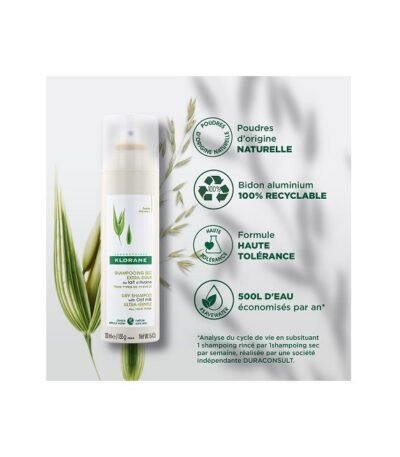 Klorane Shampooing Sec au Lait d'Avoine Extra-Doux Spray 150 ml est un shampooing sec à base de lait d'avoine qui permer de nettoyer les cheveux sans les mouiller.