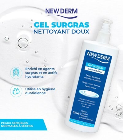 Le NEW DERM GEL SURGRAS NETTOYANT 500ML hydrate et protège les peaux sèches avec une formule douce et surgras adaptée aux soins du corps sensibles.