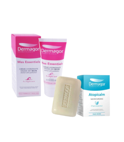 Découvrez le pack Dermagor Mes Essentiels Crème Riche + Atopicalm Savon Surgras, idéal pour les soins du corps et du visage, parfait pour peaux sensibles.