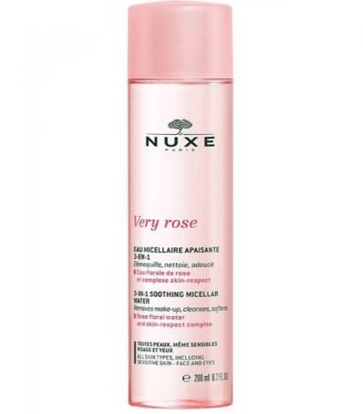Nuxe Very Rose Eau Micellaire 3en1 200ml nettoie, démaquille et hydrate en douceur les peaux sèches, alliant efficacité et soins visage naturels.