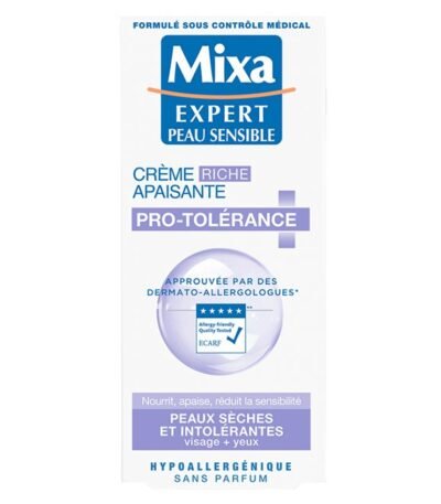 Certaines peaux sont si sensibles qu’elles ne supportent plus certains soins : elles réagissent, s’échauffent et deviennent inconfortables. On parle alors de peaux intolérantes. Découvrez la 1ère crème riche apaisante Mixa pro-tolérance. - Sa formule est préservée de la contamination par un flacon protecteur. Formulé pour minimiser les risques d’allergies, ce soin offre une tolérance optimale, même sur la zone fragile du contour de l’oeil. Il a été certi é par la Fondation Européenne pour la Recherche sur les Allergies, l'ECARF. - Une formule hydratante et ultra-apaisante : Sa formule au complexe calmant et nourrissant Oméga-PP hydrate et apaise intensément les peaux sèches et intolérantes. Les sensations d’irritations et de picotements sont soulagées. Hypoallergénique - non comédogène