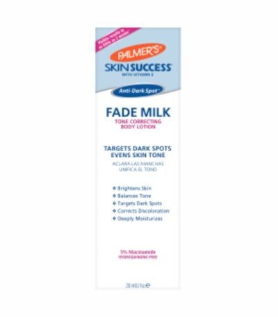 **Palmer's Fade Milk** est une lotion éclaircissante qui corrige les taches sombres et les décolorations pour un teint uniforme et éclatant. Adaptée à tout le corps, elle aide à améliorer l'élasticité de la peau, réduit les ridules, et révèle une peau plus lumineuse en seulement 2 semaines. Formulée sans hydroquinone, parabènes, phtalates, sulfates et colorants, elle n'est pas testée sur les animaux.