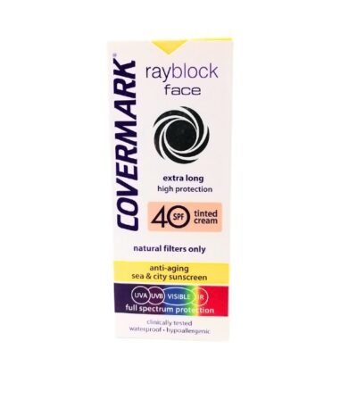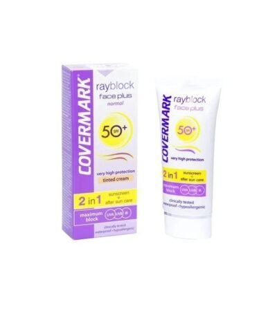 Crème solaire teintée Covermark rayblock face plus SPF50+ pour peau normale à sèche. Hydrate, protège et unifie le teint pour un visage éclatant toute la journée.