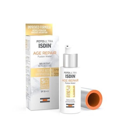 ISDIN Foto Ultra Age Repair Fusion Water 50ml offre une protection solaire visage invisible, hydratante et anti-âge adaptée à tous les types de peau.