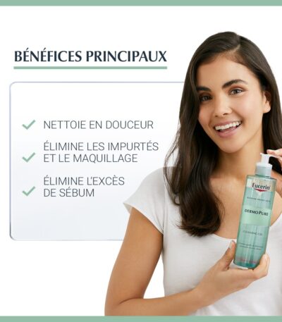 EUCERIN DermoPure Gel Nettoyant élimine efficacement et en douceur l'excès de sébum, tout en enlevant les impuretés et le maquillage, grâce à sa formule sans savon avec 6% de Tensioactifs Amphotères.