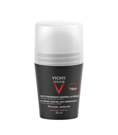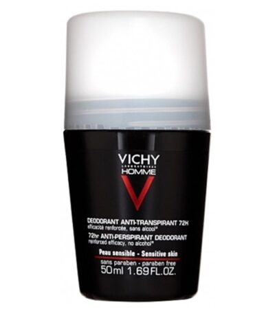 VICHY HOMME Déodorant Anti-Transpirant 72h combat la transpiration excessive et les mauvaises odeurs.