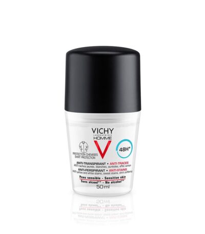 VICHY HOMME Déodorant Anti-Traces 48h ne laisse aucune trace sur vos vêtements ni sur votre peau, vous assurant ainsi un confort optimal et une fraîcheur durable.