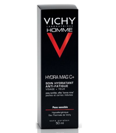 VICHY HOMME Hydra Mag C+ Soin Hydratant Anti-Fatigue recharge votre peau en énergie, atténue poches et cernes et aide votre épiderme à lutter contre les agressions.