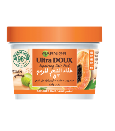 Le Garnier Ultra Doux Hair Food Papaye 390 ml nourrit et répare les cheveux abîmés grâce à sa formule enrichie en papaye et amla. Il les rend doux, brillants et faciles à coiffer. Utilisable en bain d'huile, masque ou crème sans rinçage