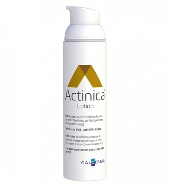Actinica Lotion SPF50+ est un dispositif médical pour la prévention de différentes formes du cancer de la peau non mélanome chez les patients à risque (immunosupprimés). Il s'agit d'une très haute protection contre les UV.