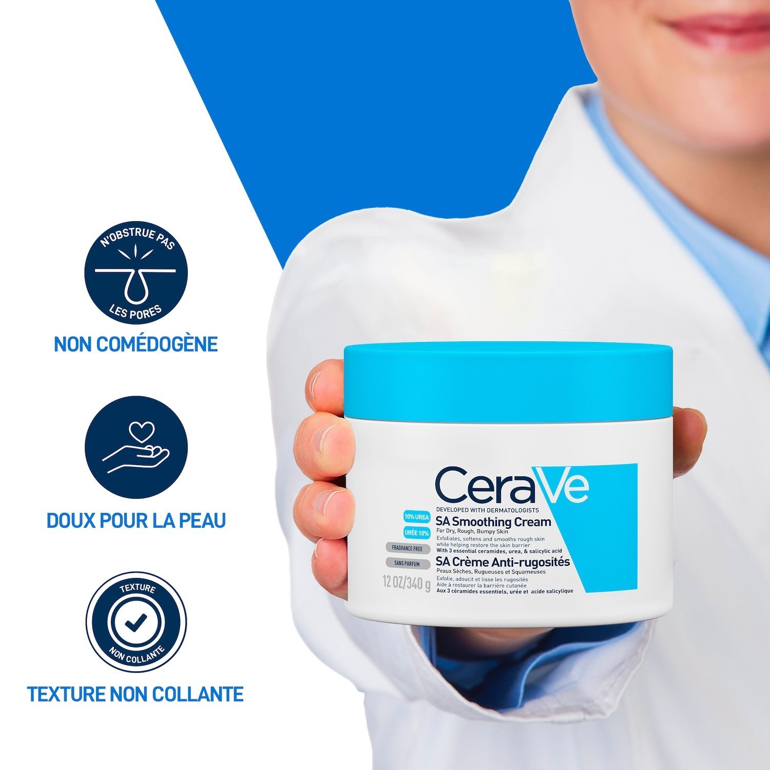 CeraVe SA Crème Anti-Rugosités, 340g, hydrate intensément et exfolie en douceur les peaux sèches et squameuses pour une peau lisse et réparée.