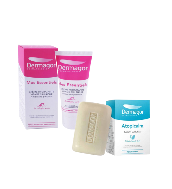 Découvrez le pack Dermagor Mes Essentiels Crème Riche + Atopicalm Savon Surgras, idéal pour les soins du corps et du visage, parfait pour peaux sensibles.