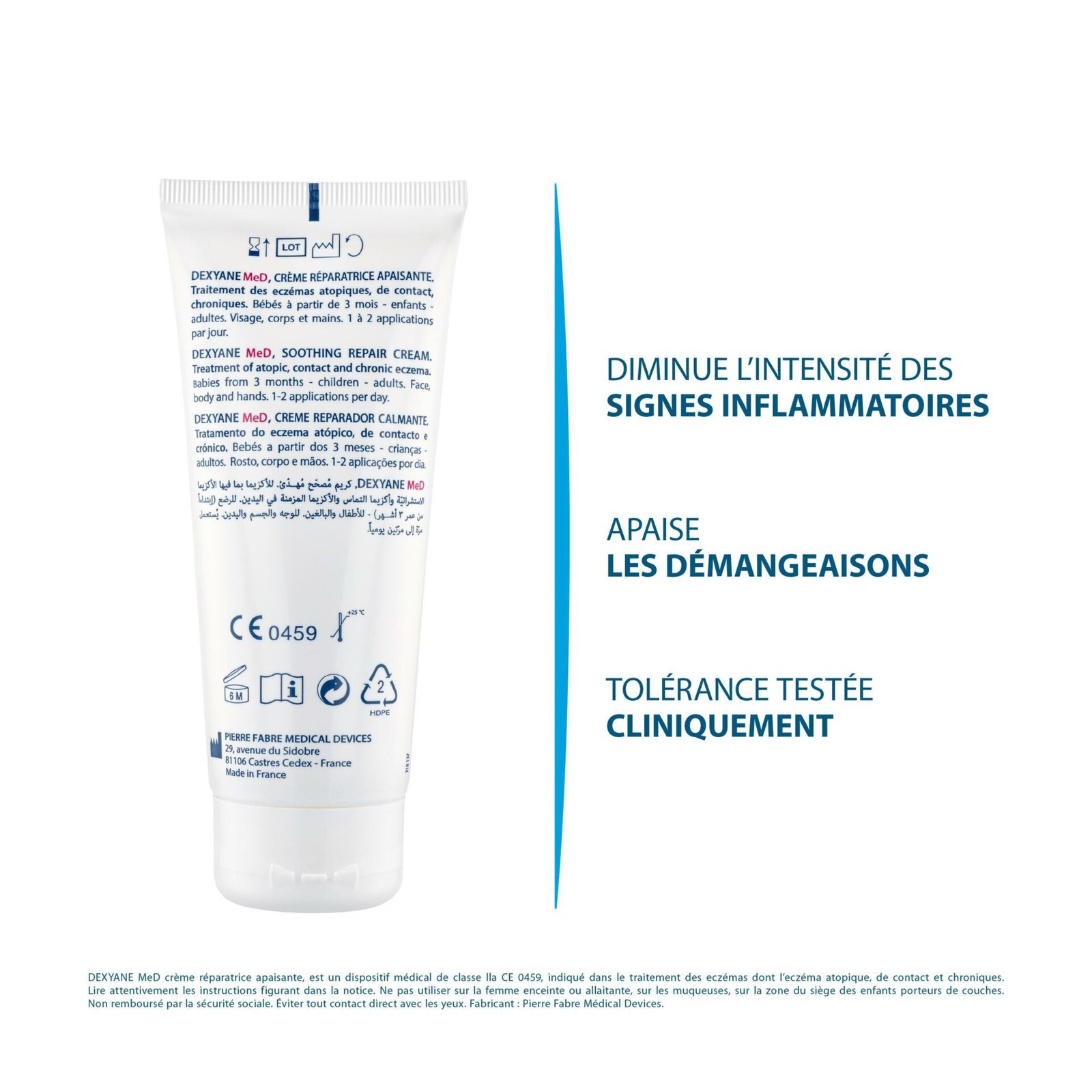 • Peut être utilisé seul, en association ou en relais des dermocorticoïdes*DEXYANE MED crème réparatrice apaisante, est un dispositif médical de classe CE. Lire attentivement les instructions figurant dans la notice. Ne pas utiliser sur la femme enceinte ou allaitante, sur les muqueuses, sur la zone du siège des enfants porteurs de couches. Éviter tout contact direct avec les yeux. À partir de 3 mois. Fabricant : Pierre Fabre Médical Devices.