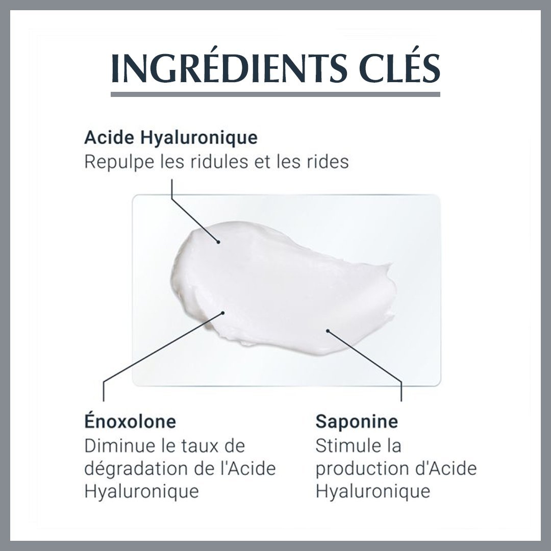 - Formule enrichie en Acide Hyaluronique pour hydrater intensément et combler visiblement les rides