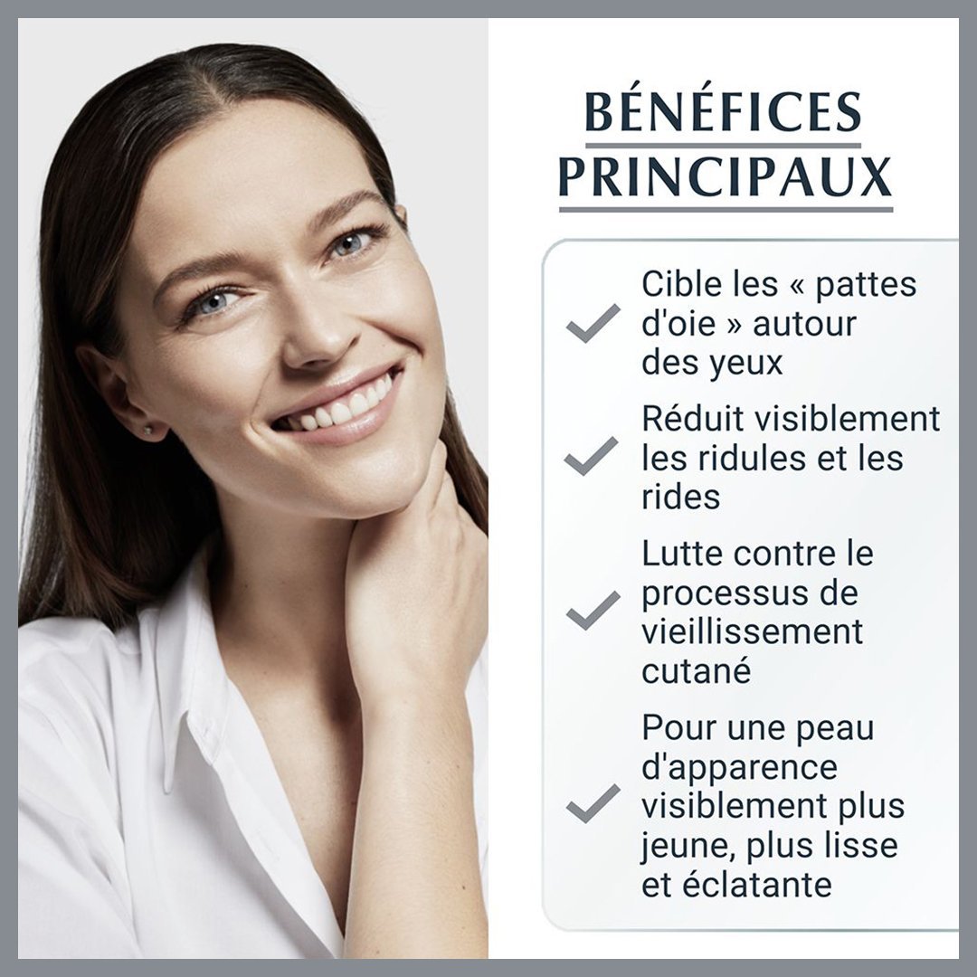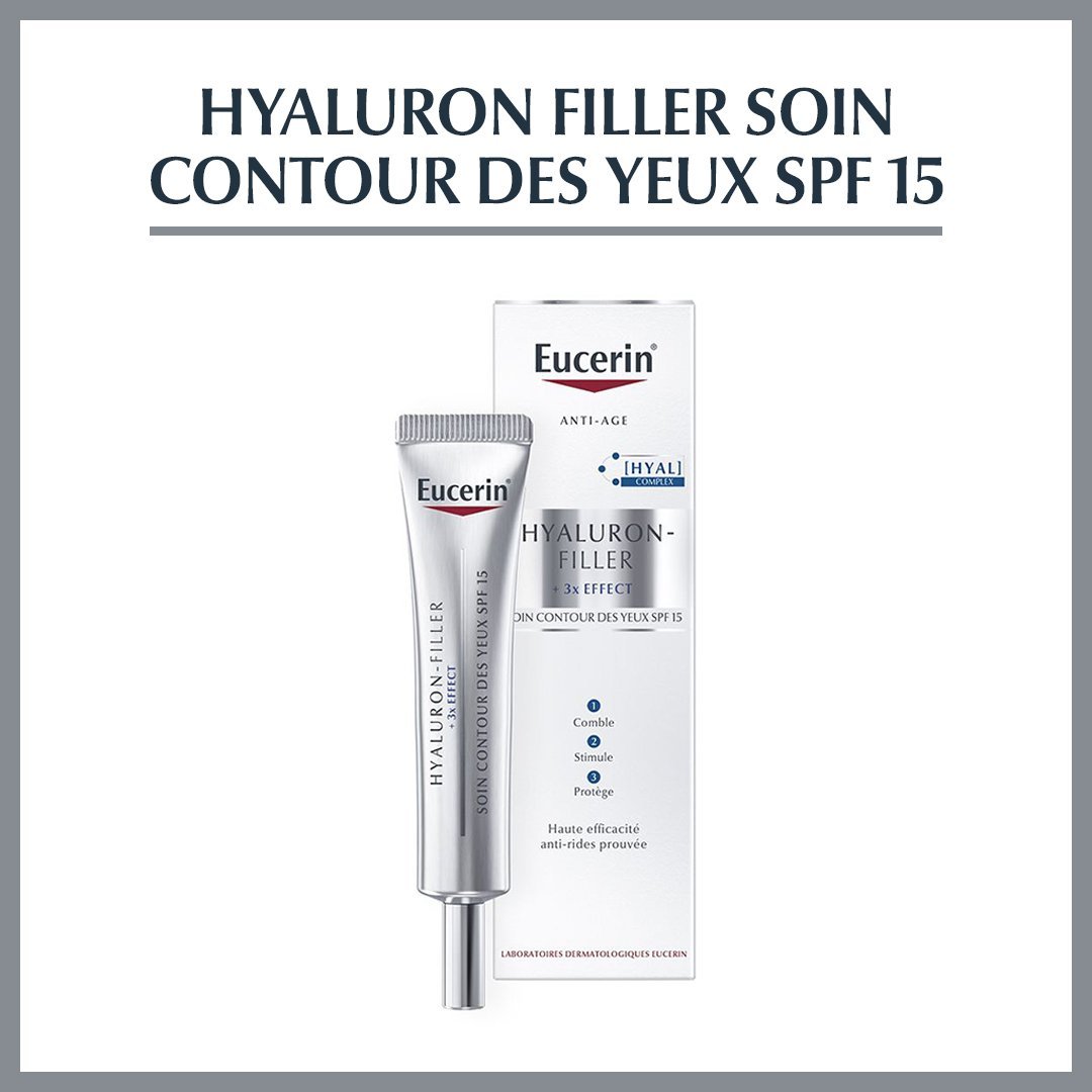 Eucerin HYALURON FILLER YEUX 15 ML, soin anti rides et anti-âge enrichi en acide hyaluronique pour lisser et raffermir le contour des yeux. Efficacité prouvée, idéal peau sensible.