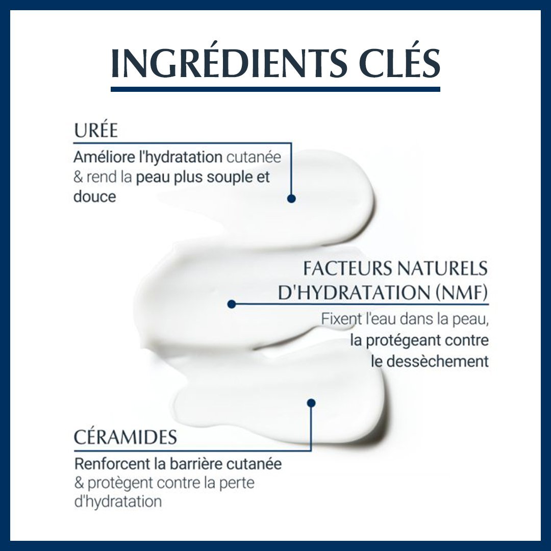Formule INCI : Aqua, Glycerin, Urea, Cetearyl Alcohol, Glyceryl Glucoside, Ethylhexyl Cocoate, Sodium Lactate, Butyrospermum Parkii Butter, Caprylic/Capric Triglyceride, Octyldodecanol, Dicaprylyl Ether, Tapioca Starch, Glyceryl Stearate SE, Hydrogenated Coco-Glycerides, Alanine, Arginine HCL, Carnitine, Ceramide NP, Cholesterol, Chondrus Crispus Extract, Glycine, Helianthus Annuus Seed Oil, Lactic Acid, Sodium Cetearyl Sulfate, Sodium Chloride, Sodium PCA, Tocopherol, Dimethicone, Methyl Benzoate, Pentylene Glycol, Decylene Glycol, Phenoxyethanol, Parfum