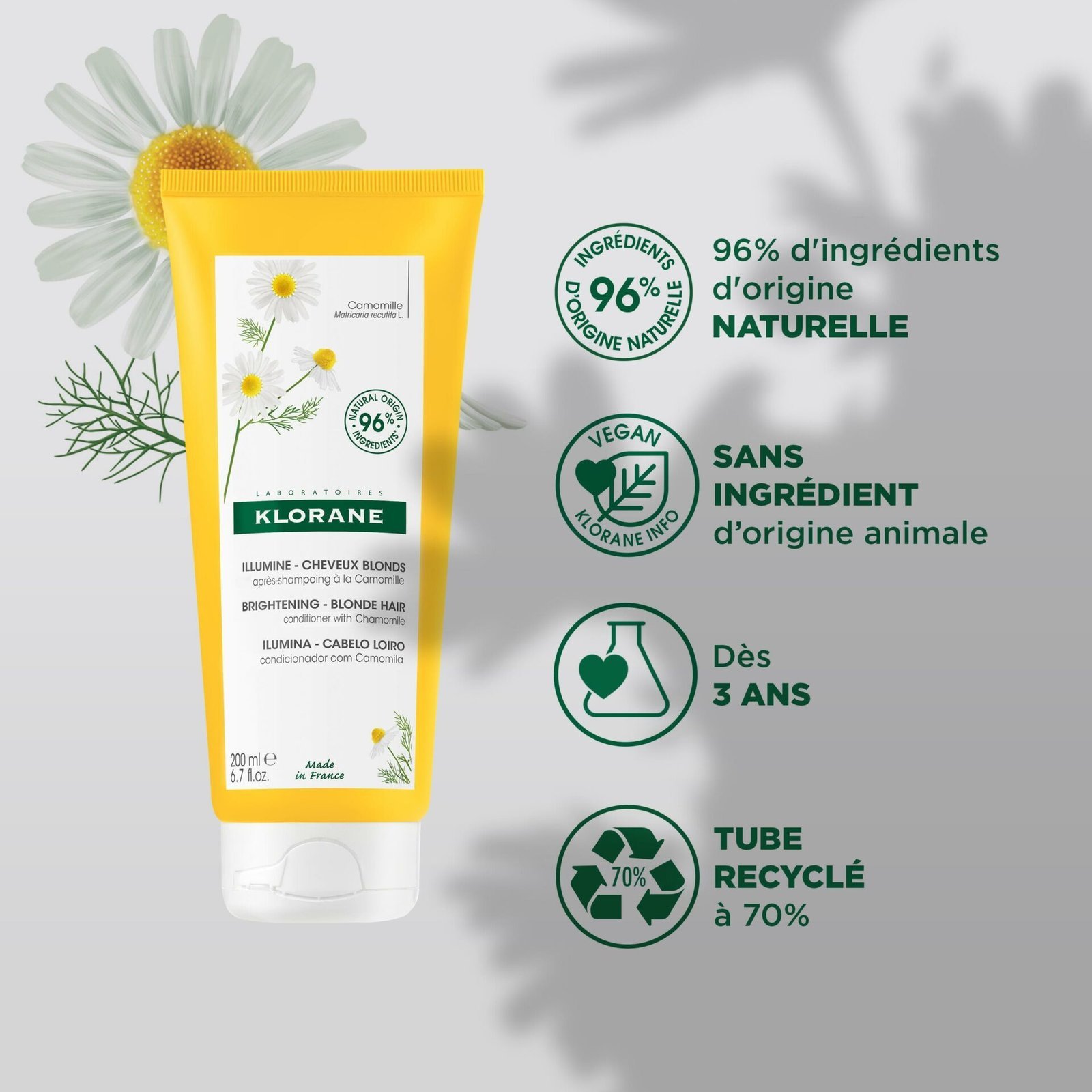 KLORANE Baume Après-shampoing à la Camomille nourrit et illumine les cheveux blonds à châtains pour des reflets éclatants. Soin doux et naturel, 200 ml.