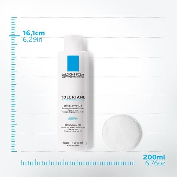 TOLERIANE Fluide Dermo-Nettoyant est un lait démaquillant haute tolérance qui aide la peau à se débarrasser des impuretés, tout en la préservant des irritations.